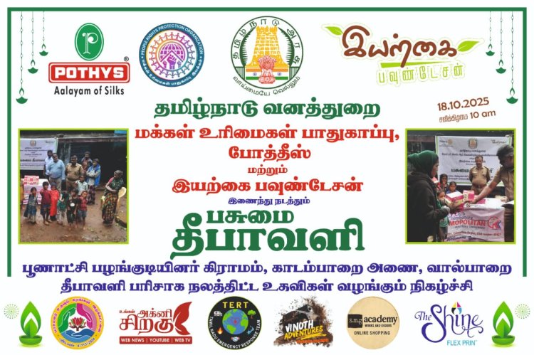 தமிழ்நாடு வனத்துறை, இயற்கை பவுண்டேசன் தன்னார்வ தொண்டு நிறுவனம், போத்தீஸ், மற்றும் மனித உரிமைகள் பாதுகாப்பு இயக்கம் இணைந்து மலைவாழ் பழங்குடியினர் 54_குடும்பங்களுக்கு புத்தாடைகளும், இனிப்புகளும் பசுமை தீபாவளி பரிசாக வழங்கப்பட்டது.
