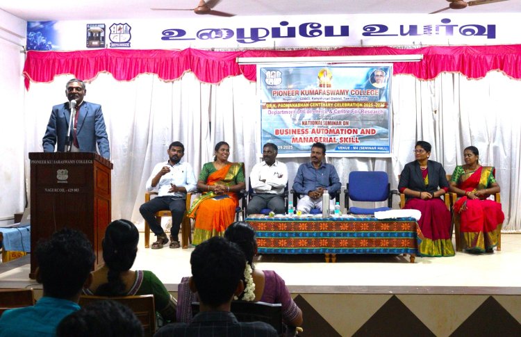 நாகர்கோவில் பயோனியர் குமாரசாமி கல்லூரி வணிகவியல் துறை மற்றும் ஆராய்ச்சி மையம் சார்பில், நிறுவனர் முனைவர் கே. பத்மநாபனின் நூற்றாண்டு விழா நிகழ்வுகளின் ஒரு பகுதியாக “வணிக தானியங்கி மற்றும் மேலாண்மை திறன்” என்ற தலைப்பில் தேசிய கருத்தரங்கம் செப்டம்பர் 2, 2025 அன்று நடைபெற்றது.